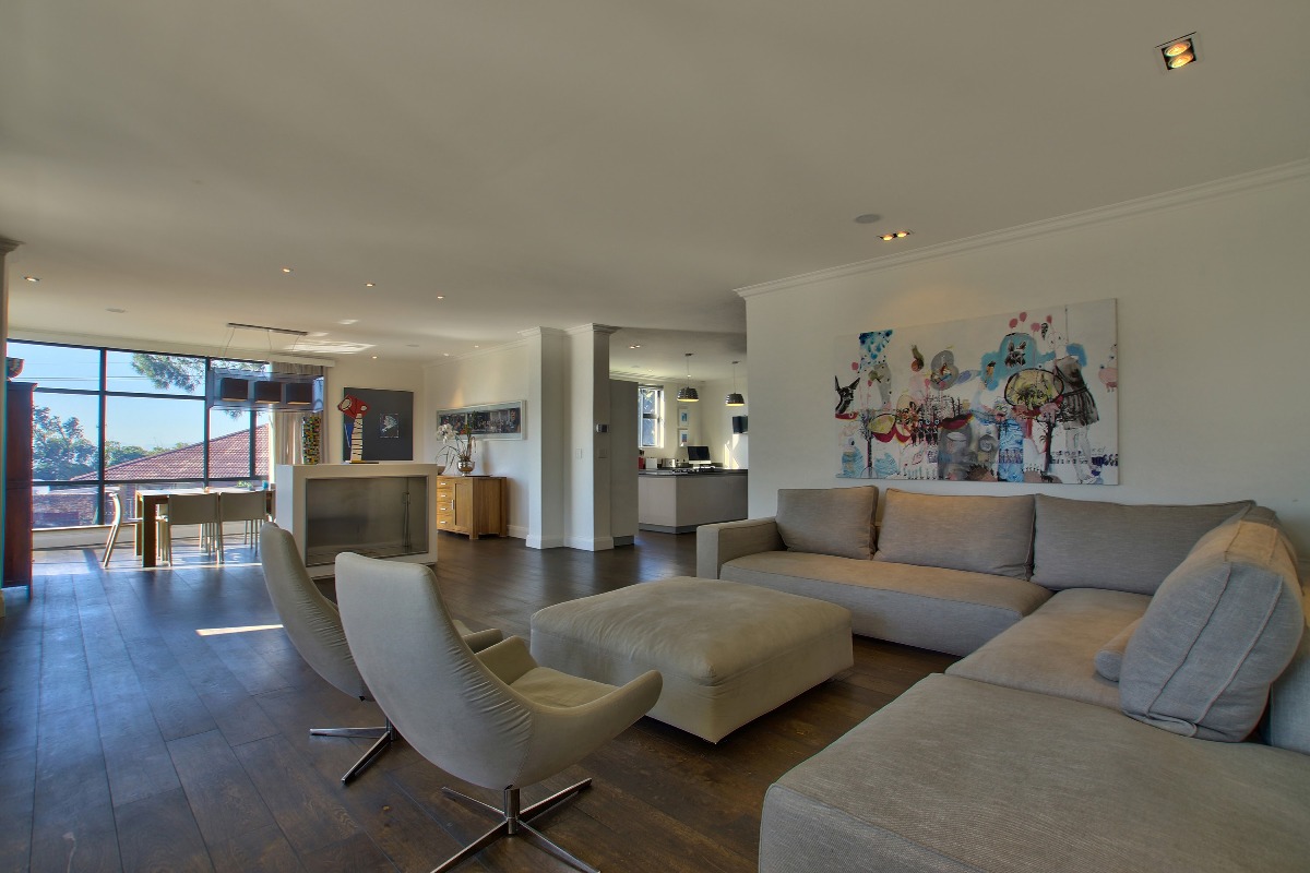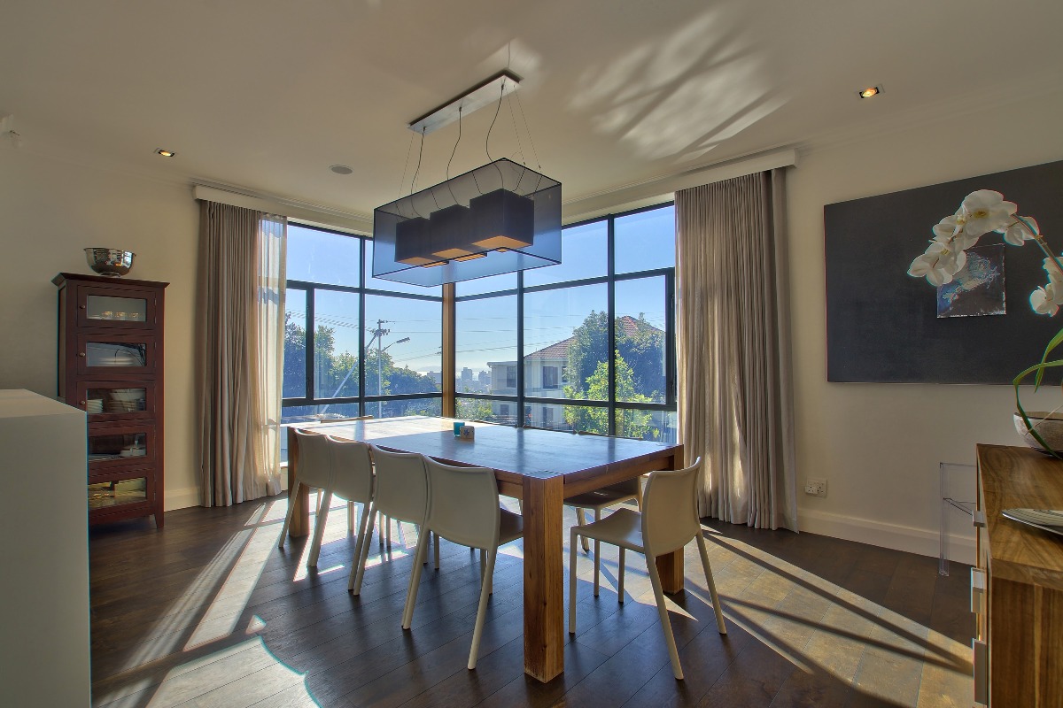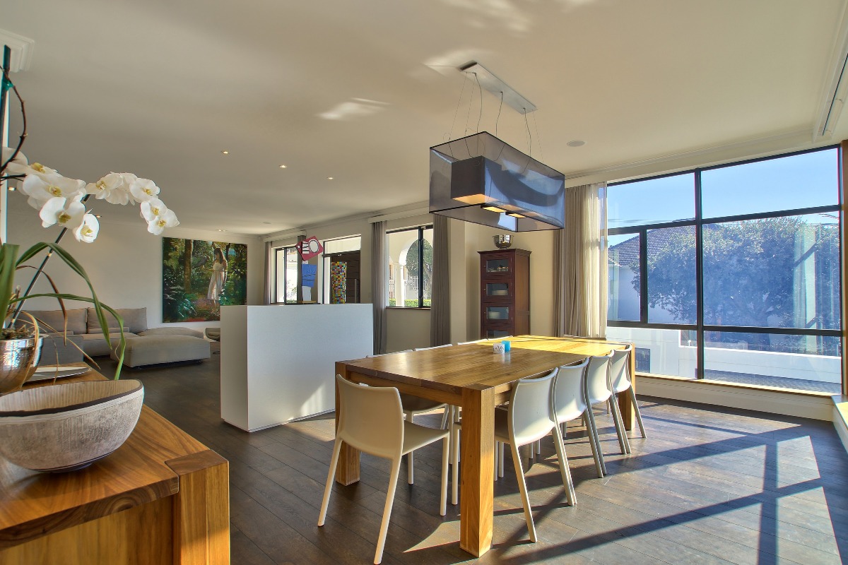 The open plan dining area has seating for 10 guests, set in a corner where floor-to-ceiling windows showcase the beautiful views. Opposite is a spacious formal lounge, where you can relax after a long day of sightseeing. Doors lead outside onto the terrace.