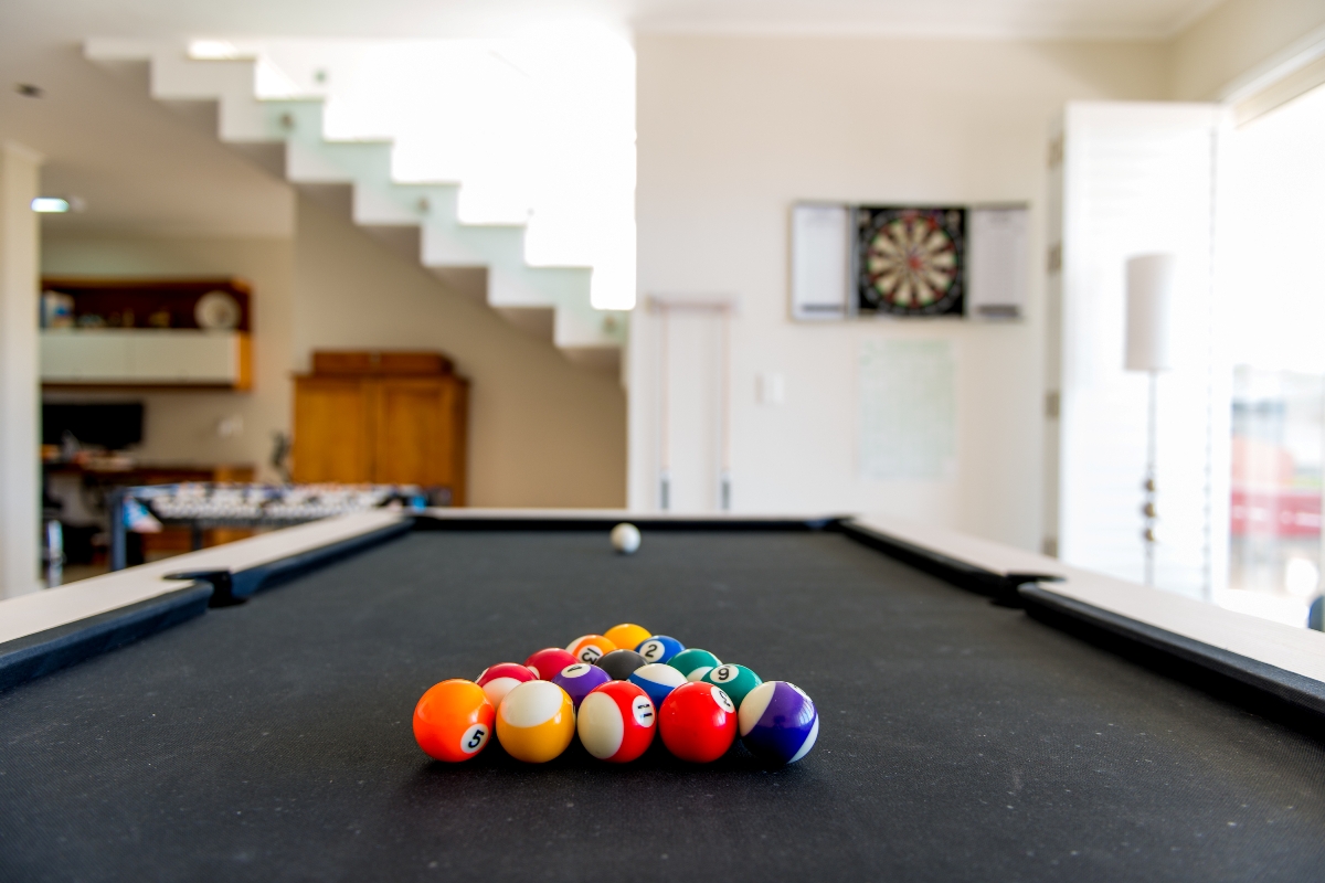 On the other side of the staircase is a games room with a pool table and foosball table. Sliding doors lead outside onto a terrace with outdoor dining for 10 guests. Steps lead down to the swimming pool area where there are sun loungers for sun bathing.