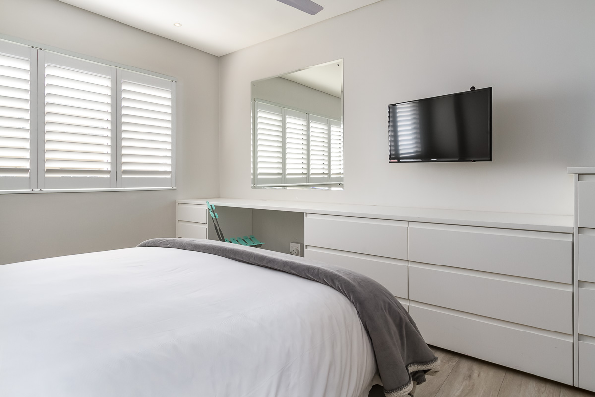 All the bedrooms feature ample cupboard space, American shutters, ceiling fans for hot nights and panel heaters for cold nights. The main bedroom has an en-suite bathroom with bath and shower, while bedroom 2 and 3 share the second bathroom (with shower only). The main bedroom and bedroom 2 also have flatscreen TV’s with DSTV.