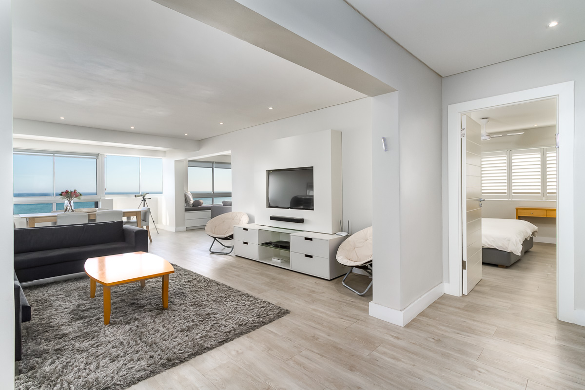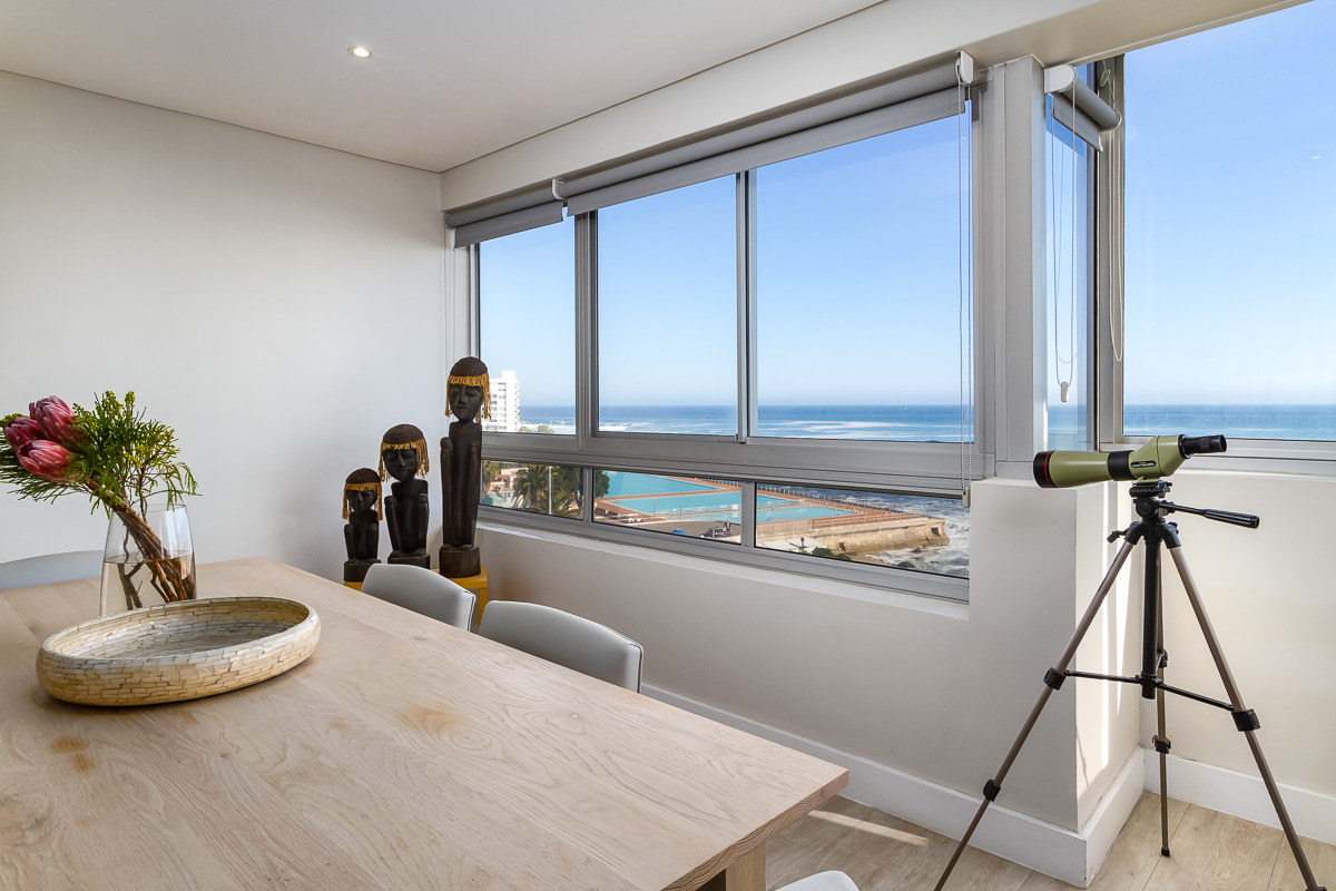 The open-plan living area offers ample space to relax and enjoy the views as the sun sets over the Atlantic Ocean. Large windows slide open to cool the listing with fresh sea air on hot days. Two panel heaters serve to warm the space on colder days. Both lounges offer flatscreen TV’s with DSTV and the dining area can seat 8.