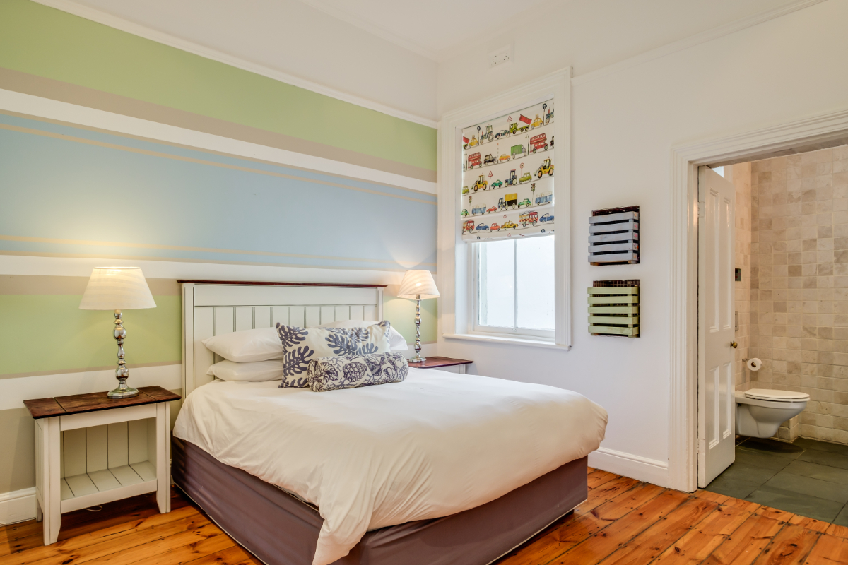Upstairs: It comfortably sleeps 6 in three en-suite bedrooms with high ceilings. The main bedroom has a king bed, the second bedroom a queen, and the kids room has two single beds. There is a sunny balcony just outside the bay window of the main bedroom.