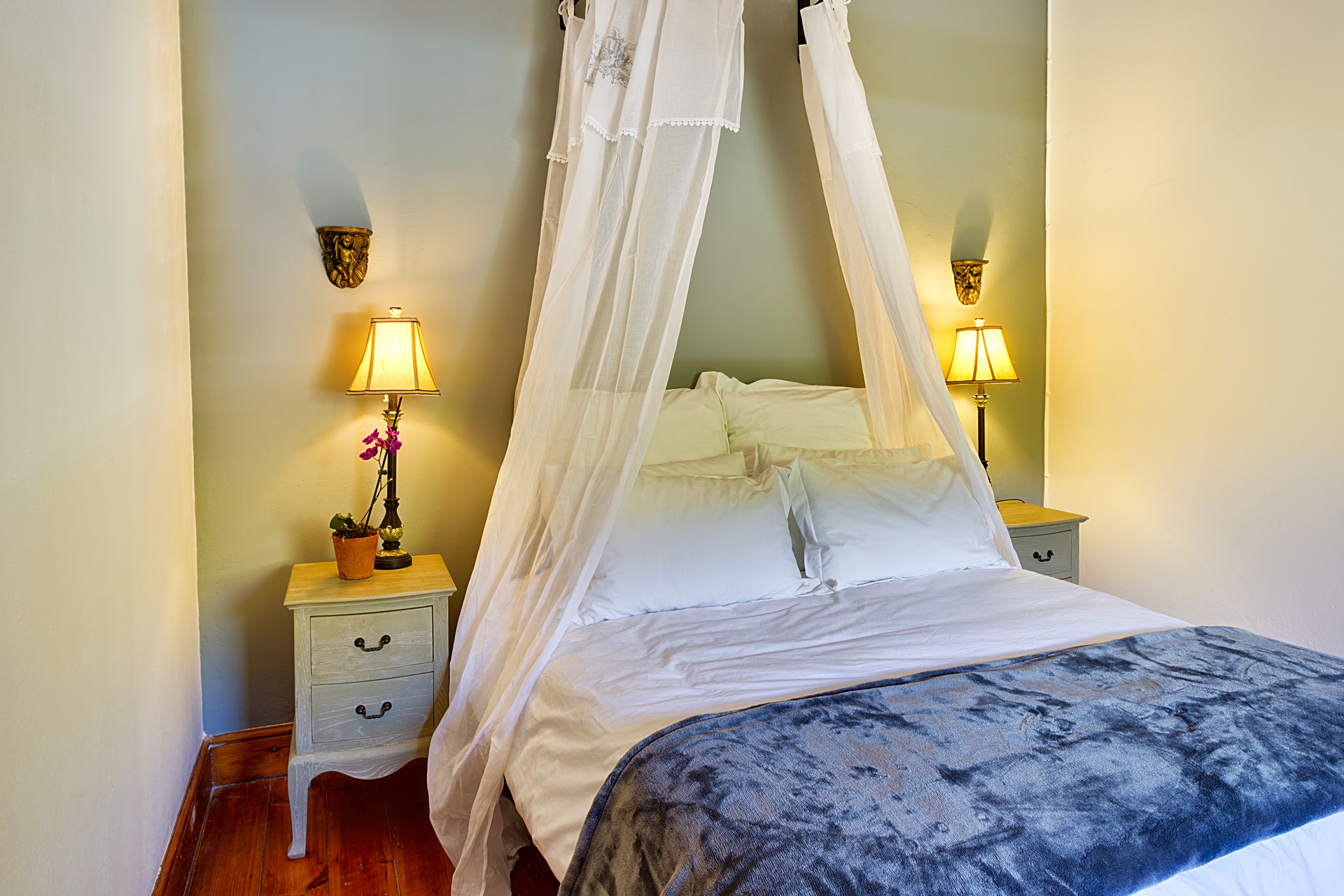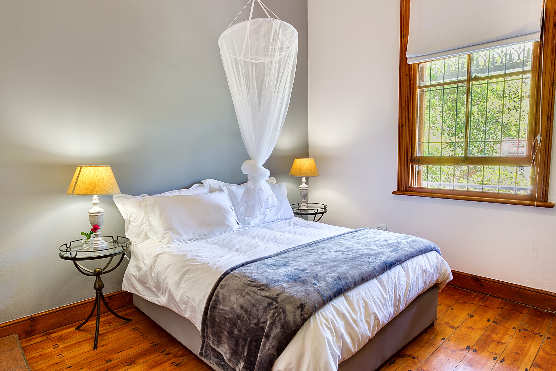 As you enter, you find yourself in a long passageway with polished wooden floors. On either side are the two bedrooms, which both have Queen-size beds and views of the front porch and garden. These rooms share a bathroom.