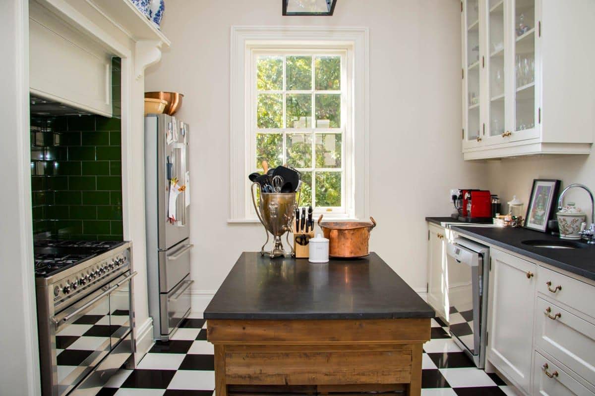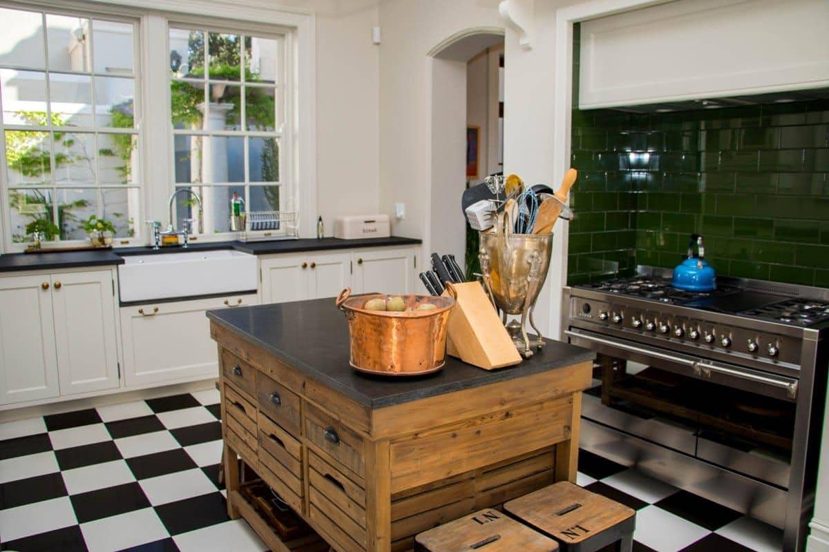The kitchen comprises of a large farm-style sink, an island in the middle ideal for food preparations and a large gas stove as well as all the basic essentials.