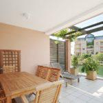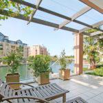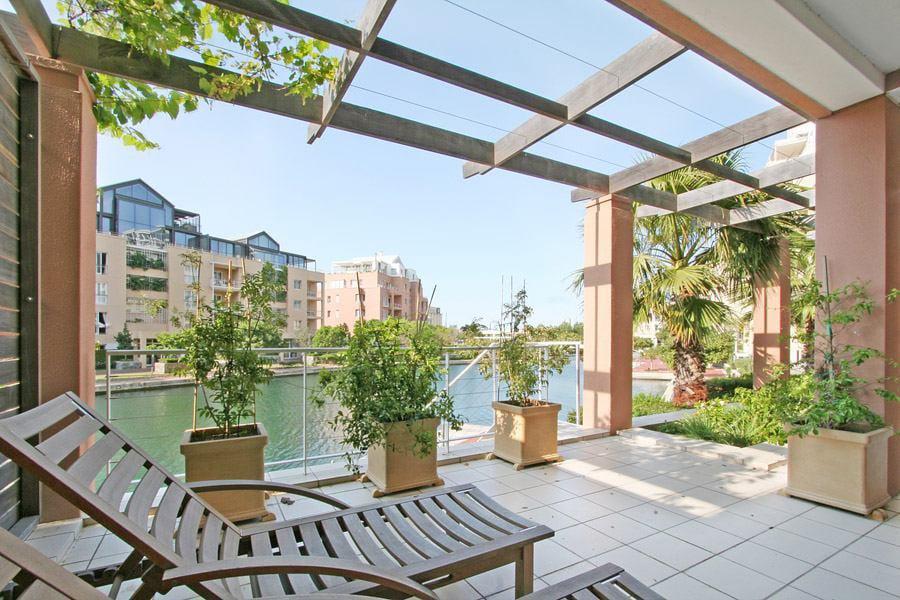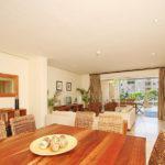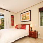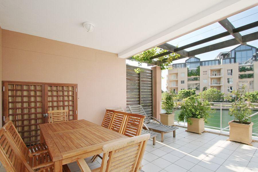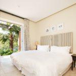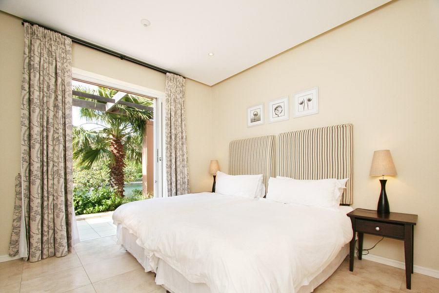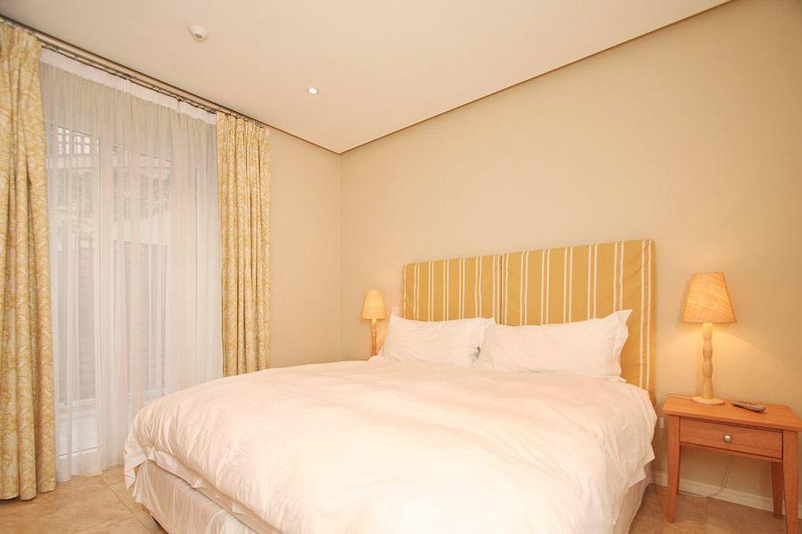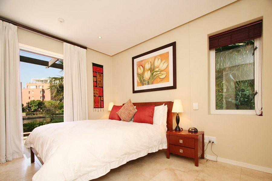 The open plan living and dining area has a modern self-catering kitchen with granite counter tops and stainless steel appliances. This leads onto a dining area with seating for 8 and an inviting TV lounge with DSTV and comfortable couches. Sliding doors open onto a ground floor balcony that offers outdoor dining and is surrounded by greenery and beautiful views of the canals.