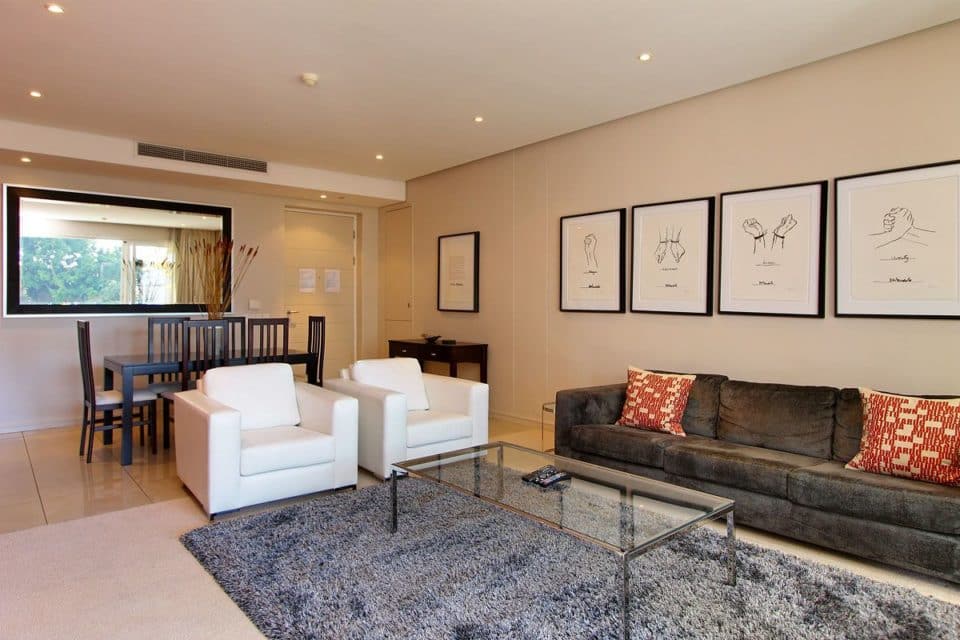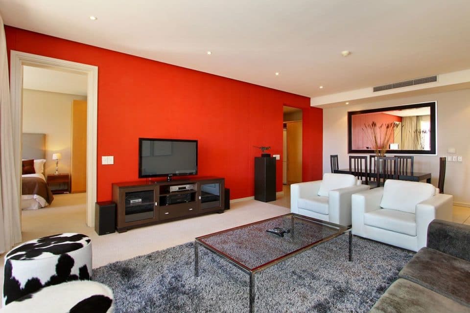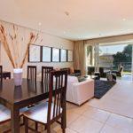 The open plan living area has dining for 6 guests, leading onto a large lounge with a luxurious couch and two arm chairs. The lounge has a plasma screen with DSTV and DVD player. Off of this room is the self-catering kitchen, with an electric HOB and everything you need to cook a delicious meal. The bedroom also leads off of the lounge and boasts a Queen-size bed and en-suite with shower over the bath.