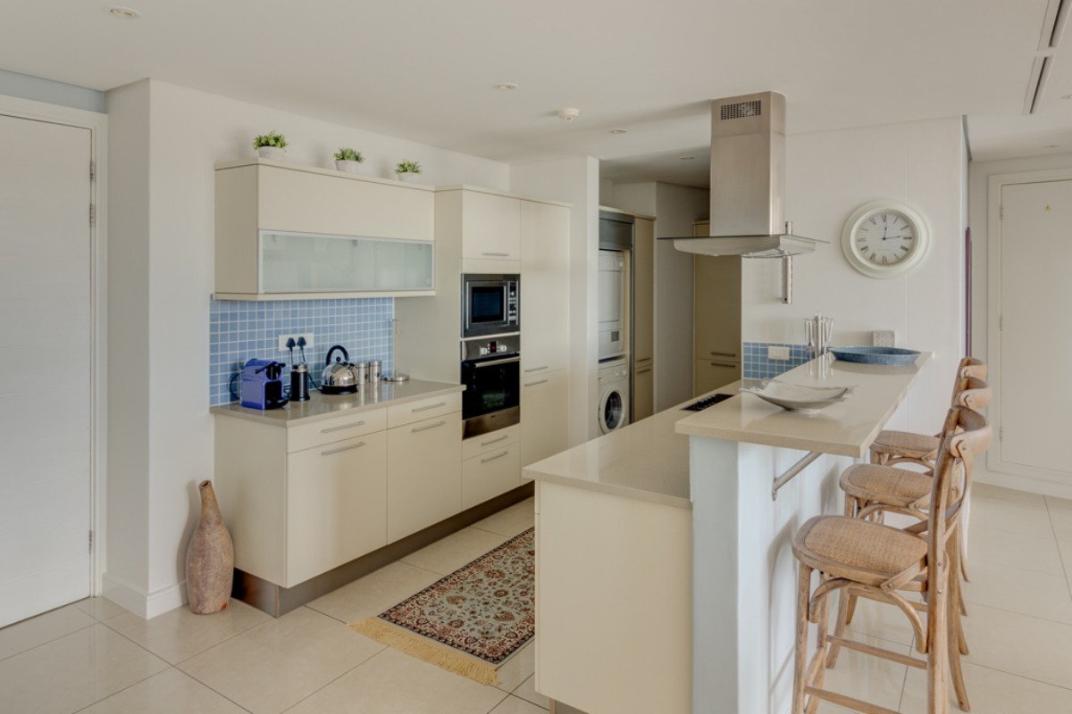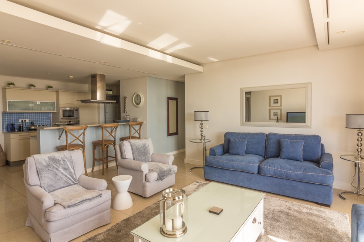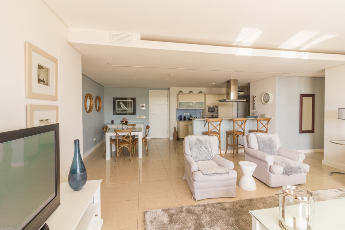 In the main living area is a fully equipped kitchen with a separate scullery, dining for four guests and a spacious TV lounge with comfortable couches. Sliding doors lead out onto the balcony where you will find sun loungers and outdoor dining.