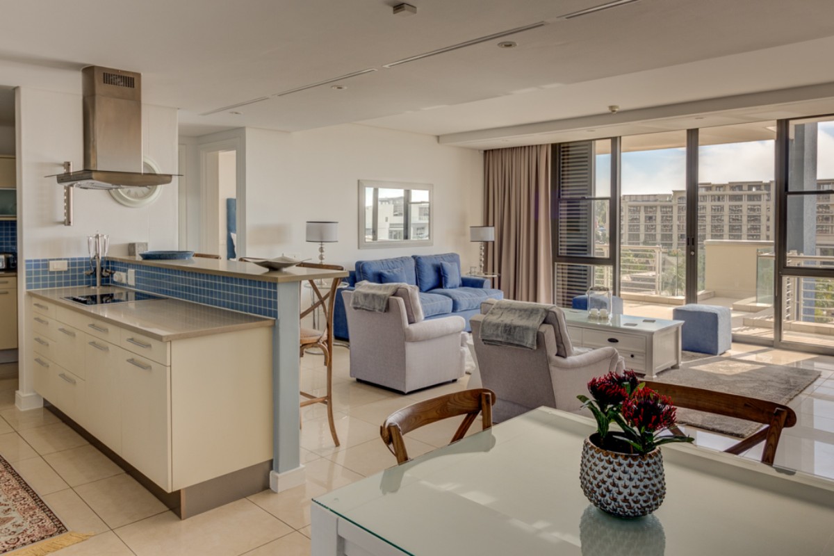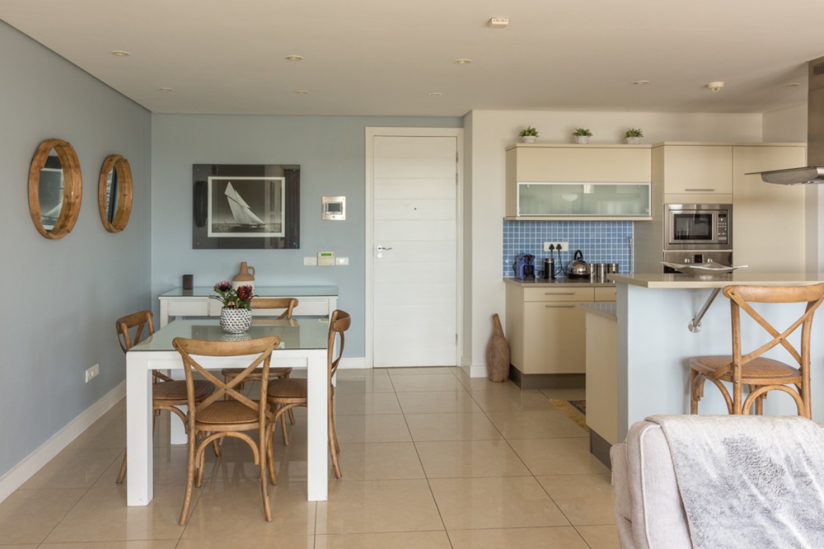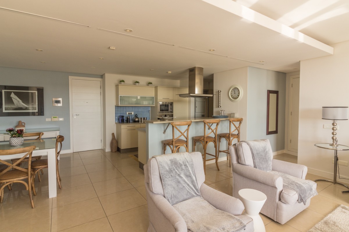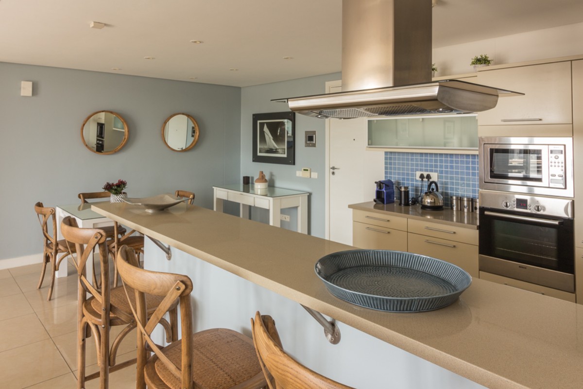 In the main living area is a fully equipped kitchen with a separate scullery, dining for four guests and a spacious TV lounge with comfortable couches. Sliding doors lead out onto the balcony where you will find sun loungers and outdoor dining.