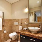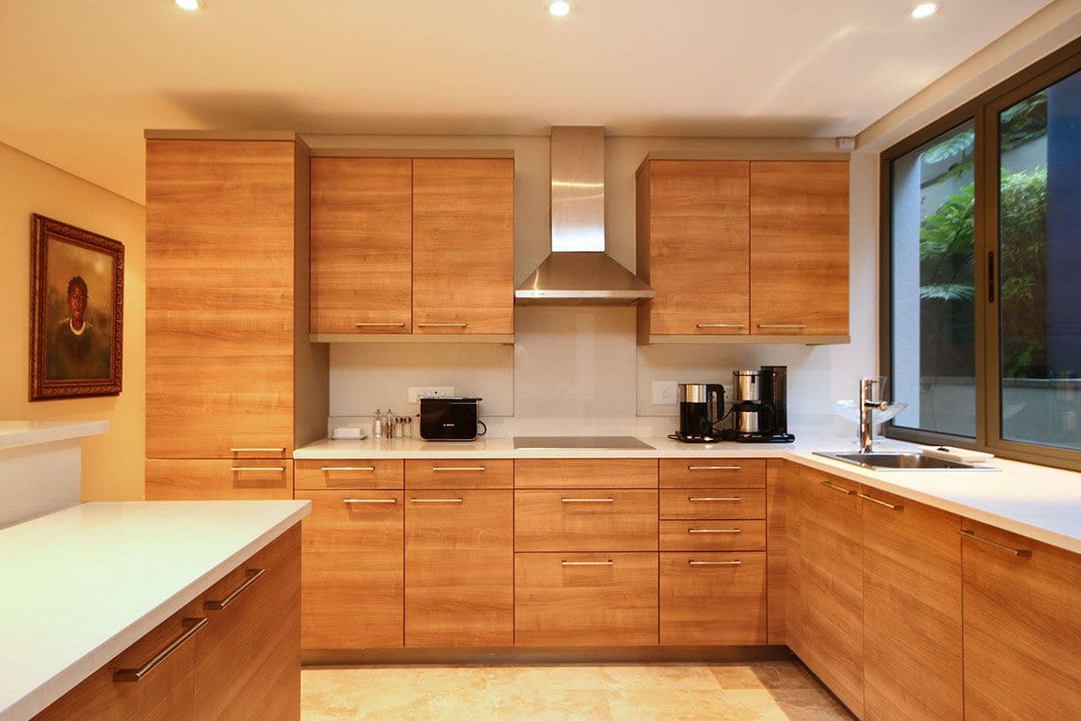 As you walk-in the apartment you enter the dining room with seating for 6. To the right is the kitchen, with wooden cupboards and white granite counter tops. There is plenty of space for those who enjoy cooking and everything you’d need, as well as a coffee machine for early mornings.