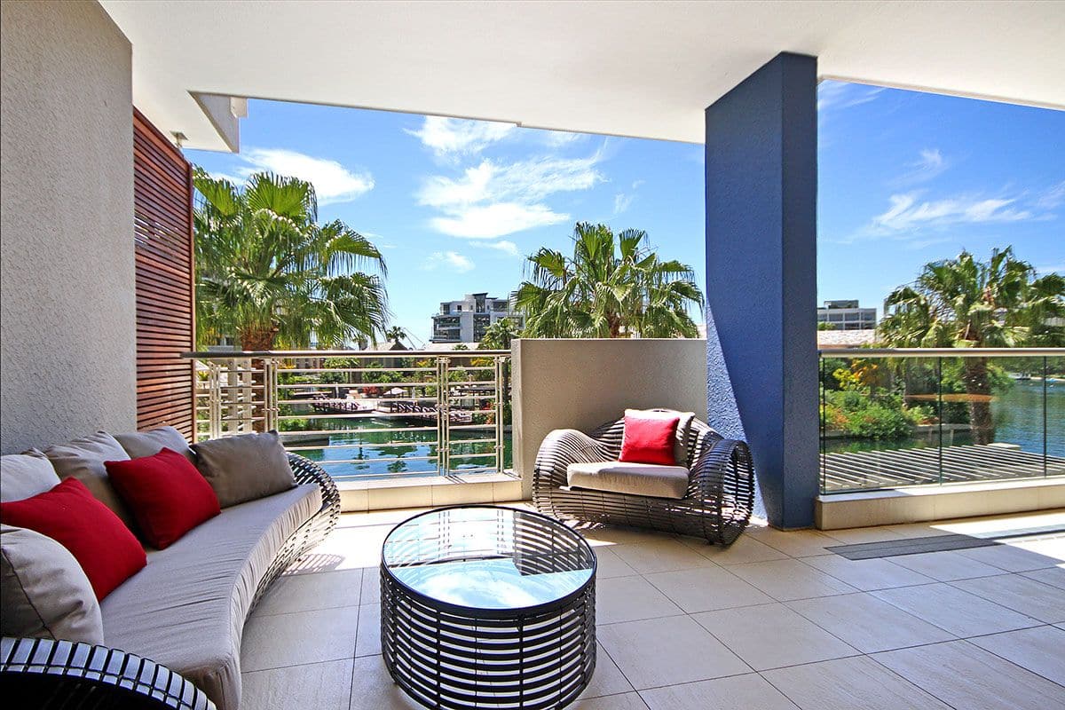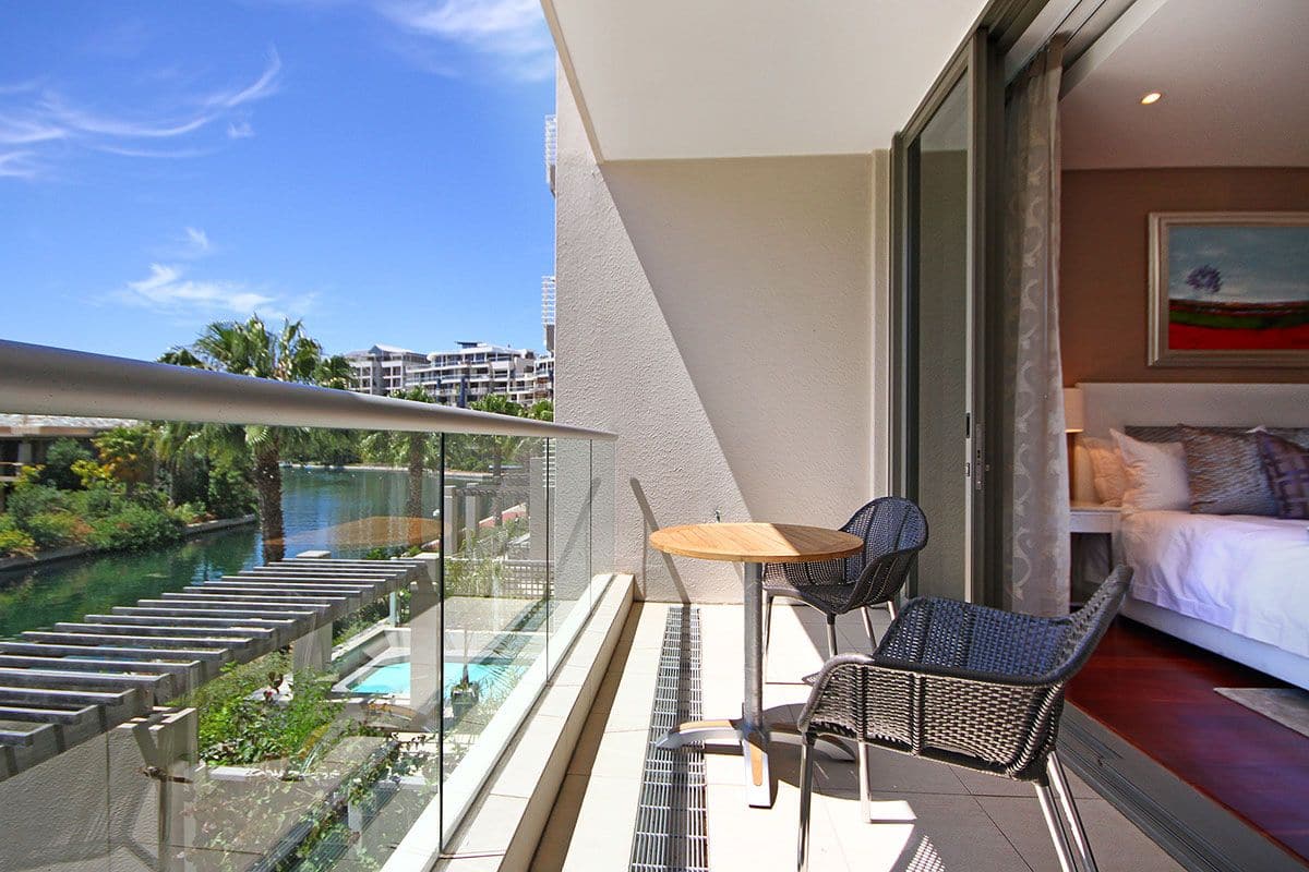 Open plan to the dining area is a spacious lounge with seating for up to 6 guests on luxurious couches, all set around a flat screen TV. Sliding doors open onto the balcony with comfortable patio furniture and stunning views of the waterway’s and marina.