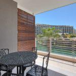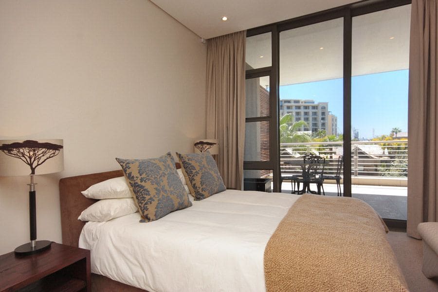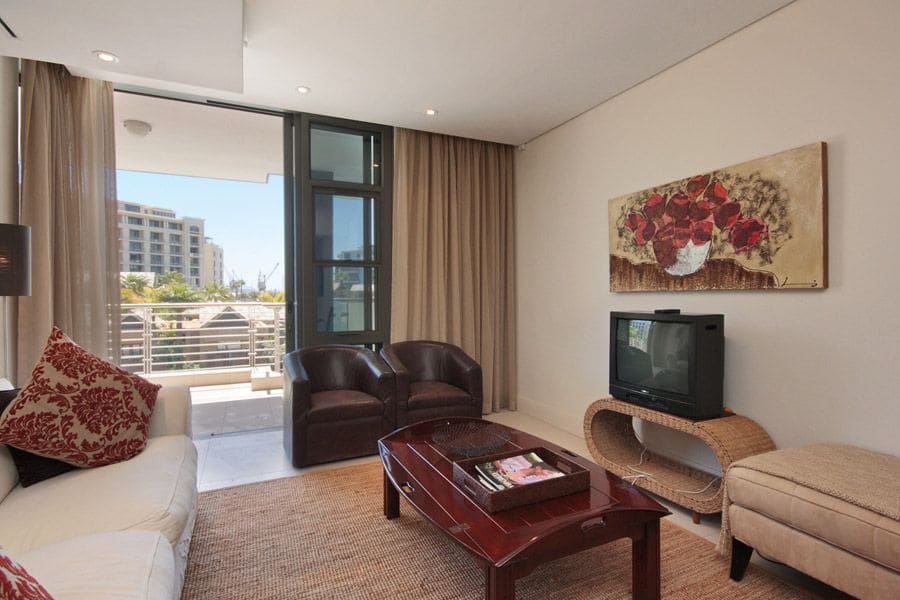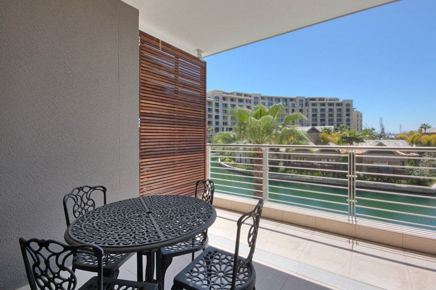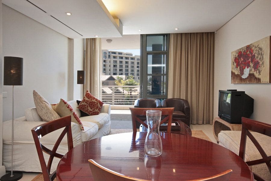 The main living and dining area consists of a compact kitchen with granite countertops and is fully equipped with modern appliances. A dining table has seating for 4 guests and is open plan to a lounge with a comfortable two-seater couch and plasma TV with DSTV. Sliding doors lead out onto a balcony with stunning views of the waterways and Marina.