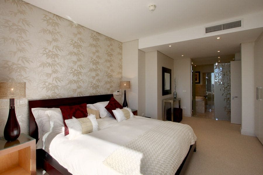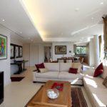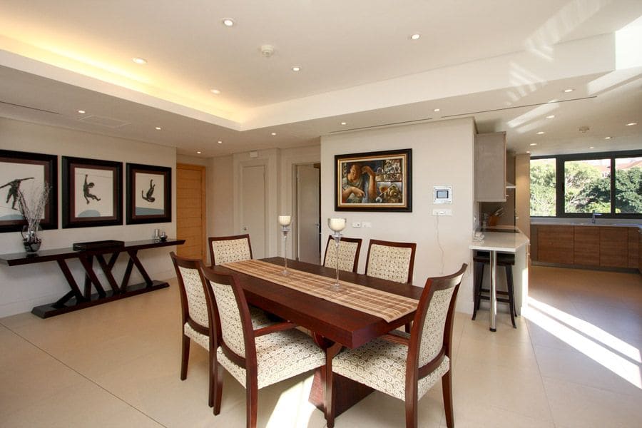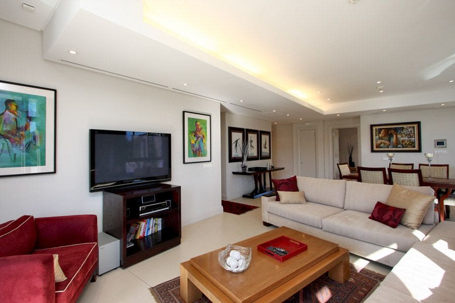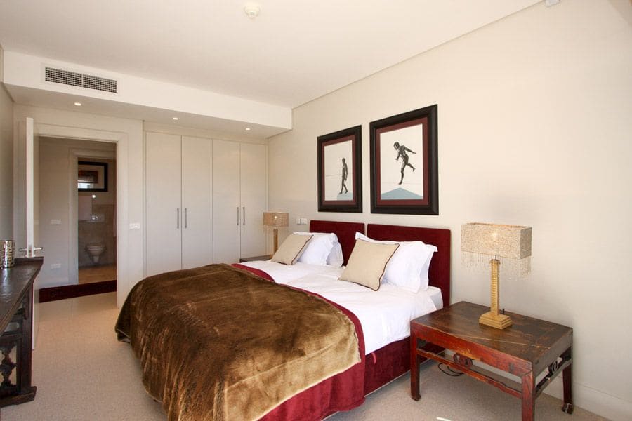 As you step inside, classic and comfortable furnishings create an elegant space which will make you feel at home. The main living area features beautiful artwork and also has formal dining for 6 guests as well as a lounge with two large white couches and a flat screen TV with DSTV. Sliding doors lead outside onto a spacious balcony with comfortable patio furniture and views of the marina and waterways. Leading off from the dining area is a fully equipped kitchen with electric HOB, breakfast bar, dishwasher and laundry facilities.