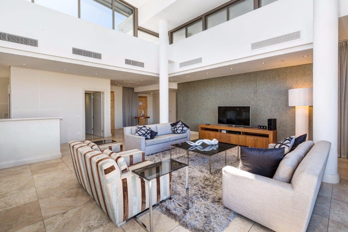 The fully equipped kitchen is spacious and has all the essentials as well as a breakfast bar. This leads into the dining area, with seating for 8 guests. There is a large TV lounge area with comfortable seating for 6 guests and outdoor access onto the wraparound balcony.