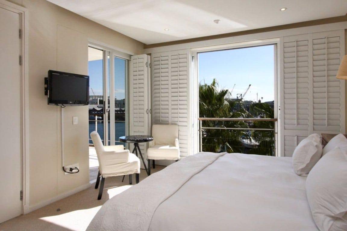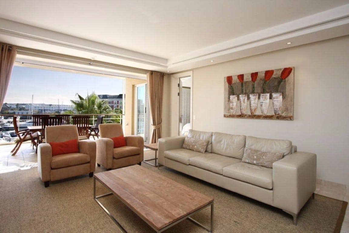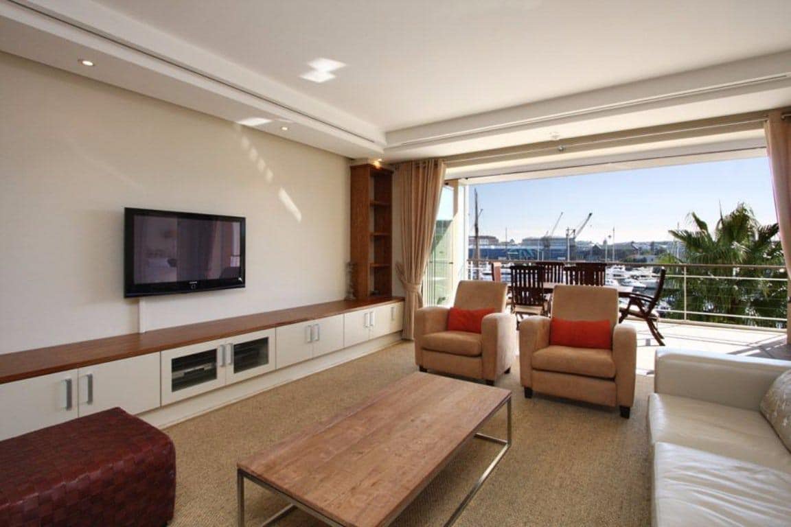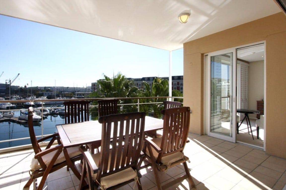 The lounge is lovely and light as it has floor to ceiling glass doors which open onto a balcony. Dine al fresco while enjoying views of the harbour and popular Cape Town Wheel. Inside, there is a TV with satellite channels and comfortable seating for six guests.