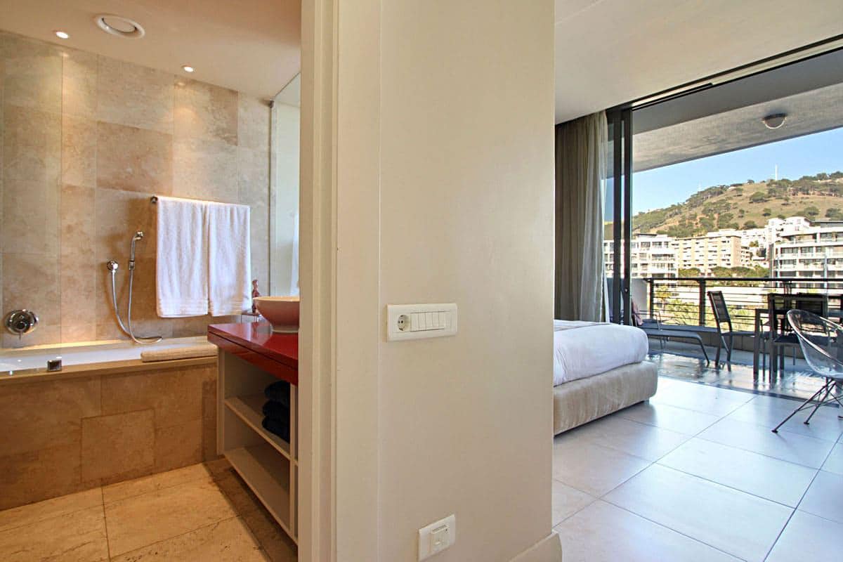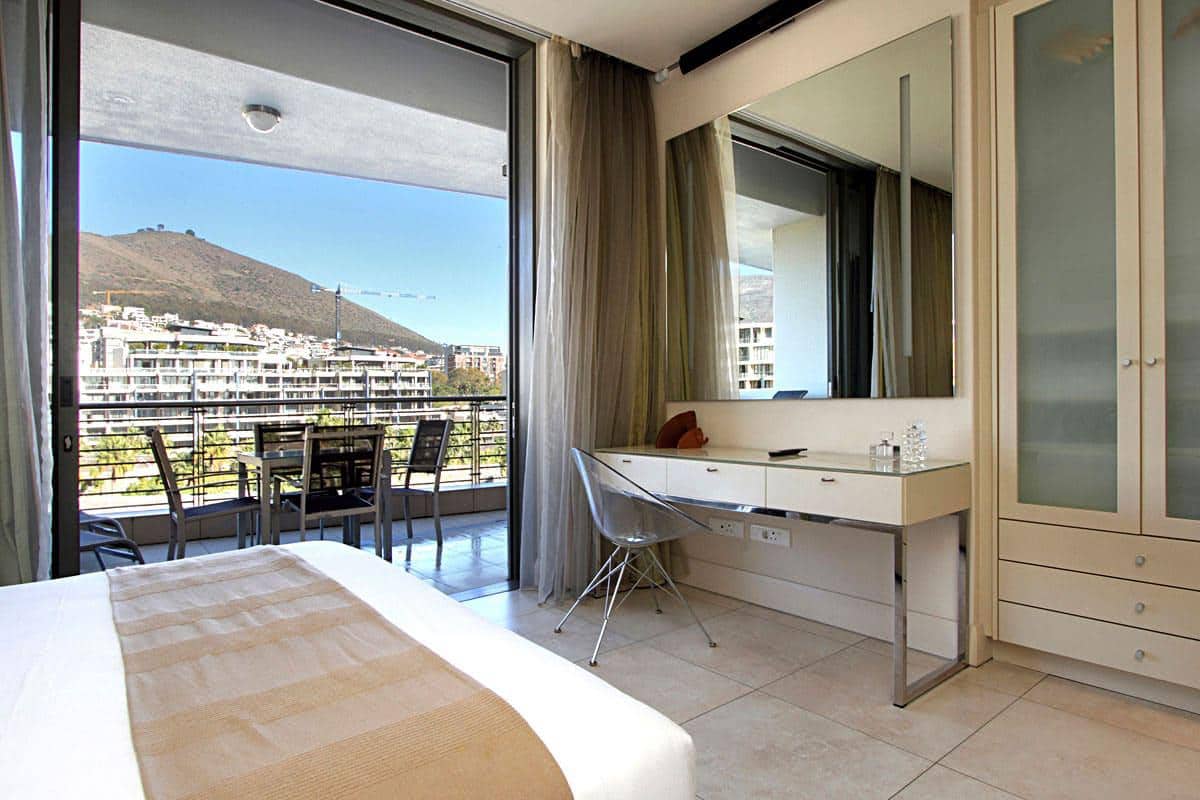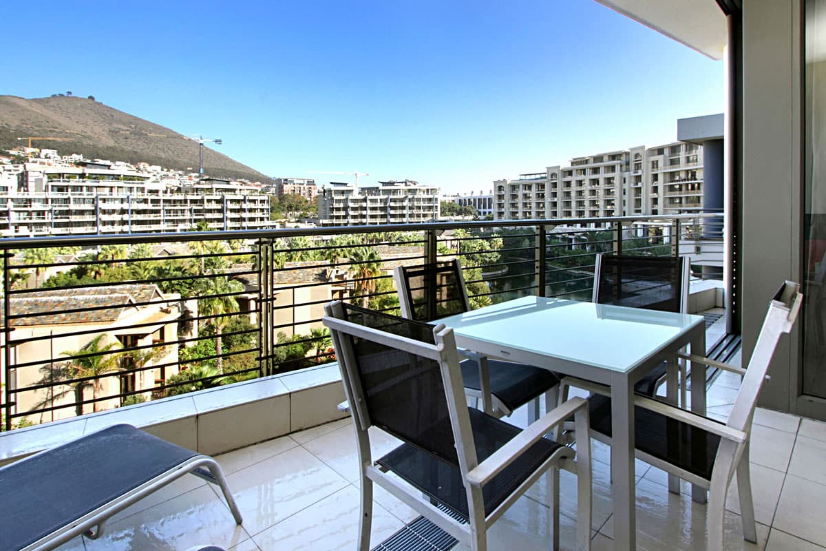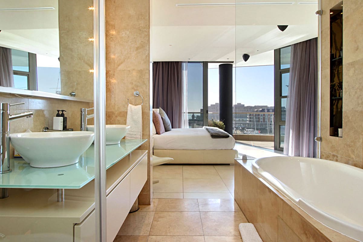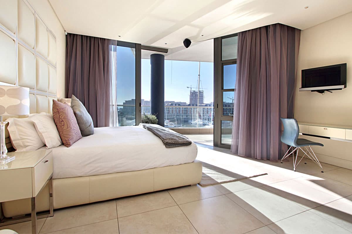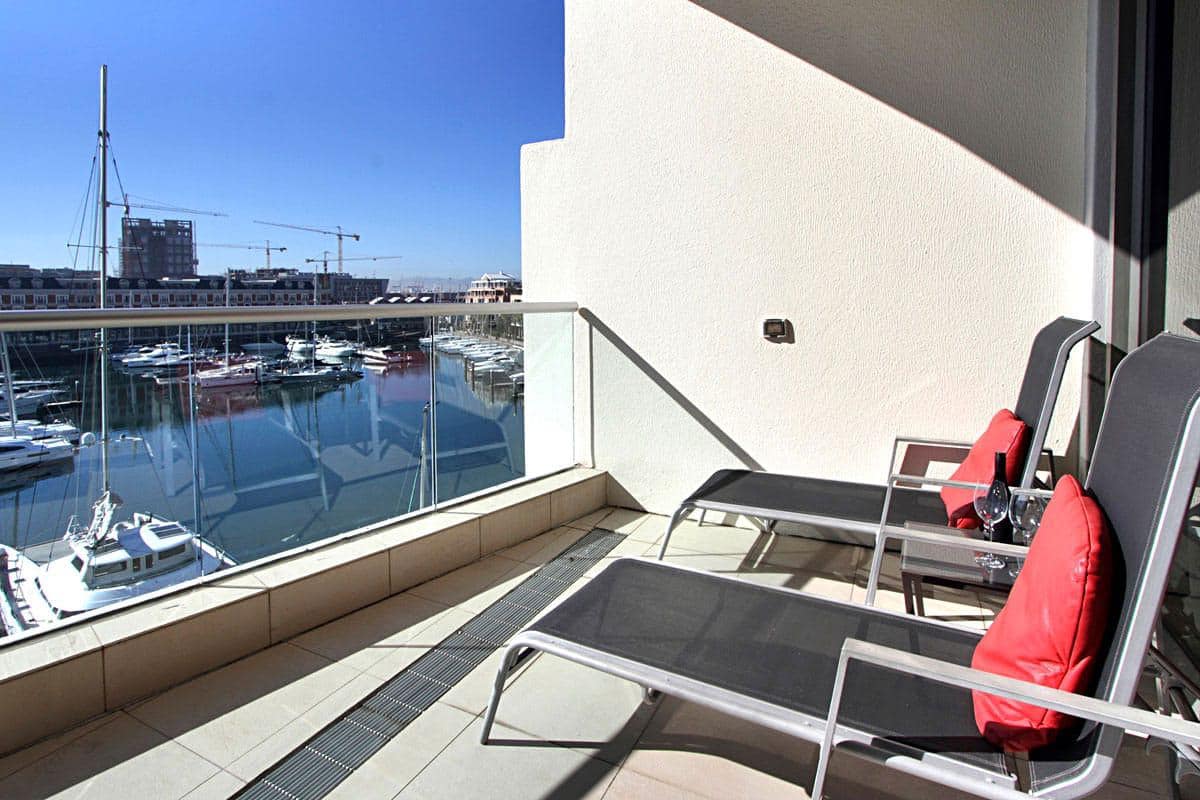 Floor to ceiling doors open onto a large balcony overlooking the Waterfront Marina and the Cape Grace Hotel and beyond through the Bascule Bridge, then the Swing Bridge at the Clock Tower and out on to the open sea. This is a perfect place to have breakfast as the V&A Waterfront is waking up. Even better, enjoy a sundowner while surveying the luxury yachts come back from a days cruising