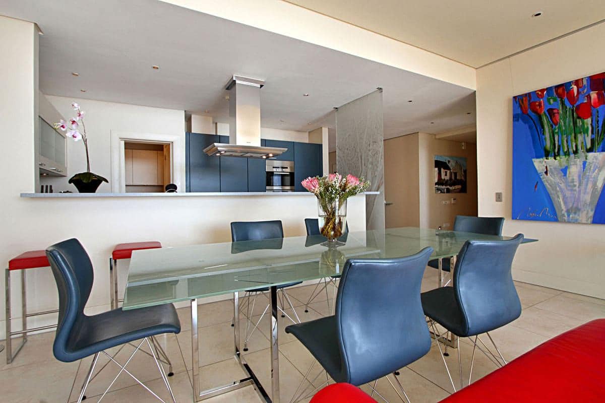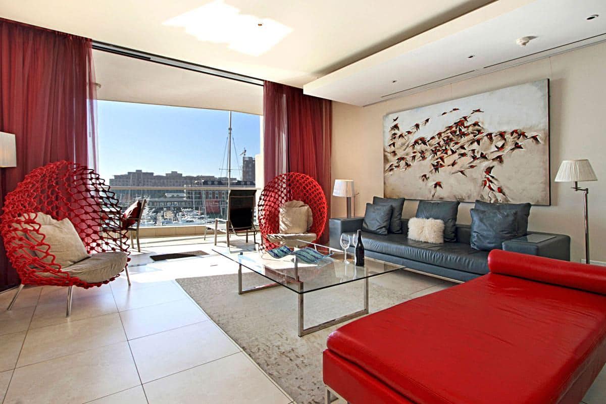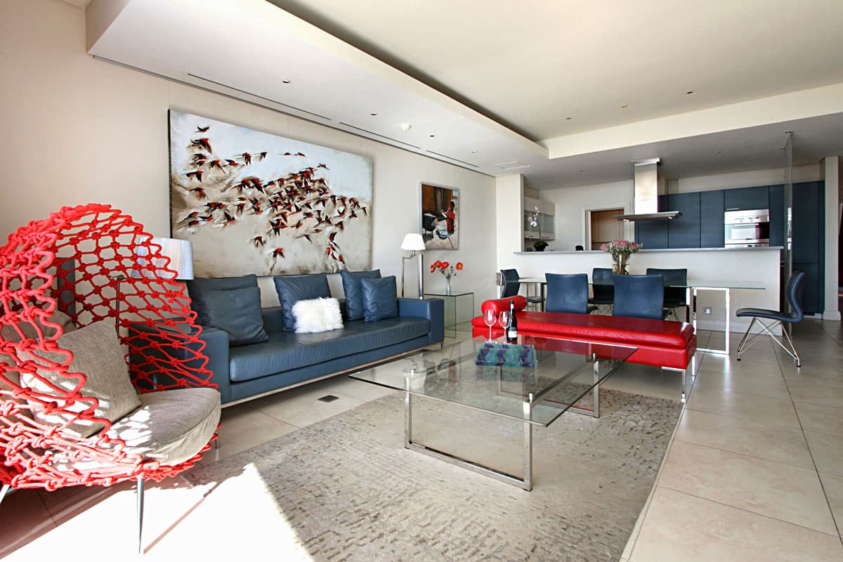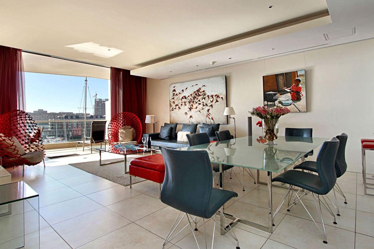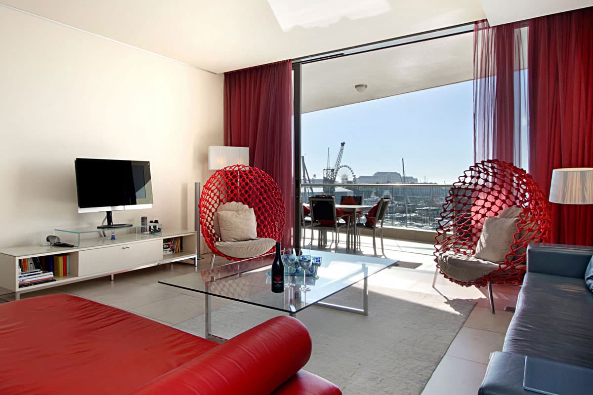 Leather, wood, glass and chrome combine to express a fresh “new millennium” look to the best luxury serviced apartment Cape Town has to offer. Splashes of primary colours from original canvasses and artworks add vibrancy and interest to the spacious, yet homely, open planned lounge and dining area. The contemporary leather sofas are softened with flocati scatter cushions while the Chilli red silk drapes overlain with burgundy metallic organcy are dreamy. Relax here after dinner with the shimmering lights of the V&A Waterfront outside.