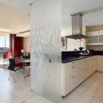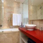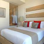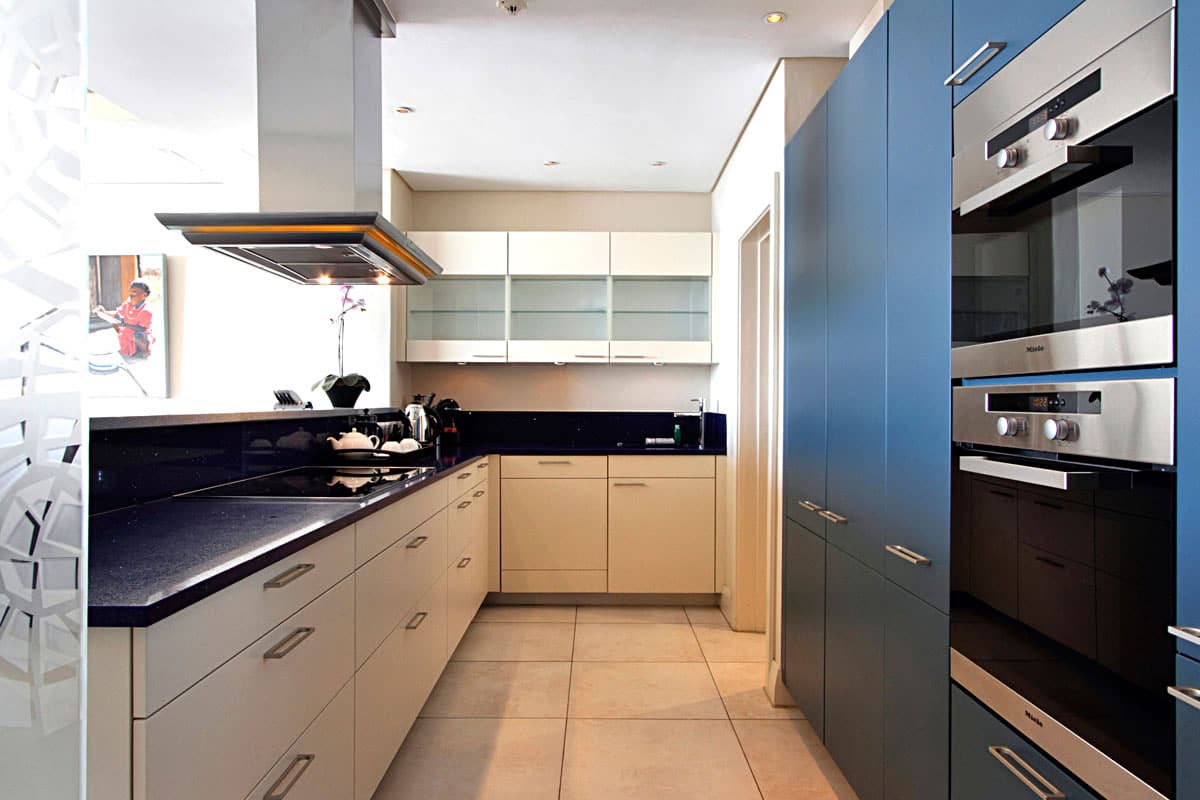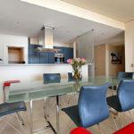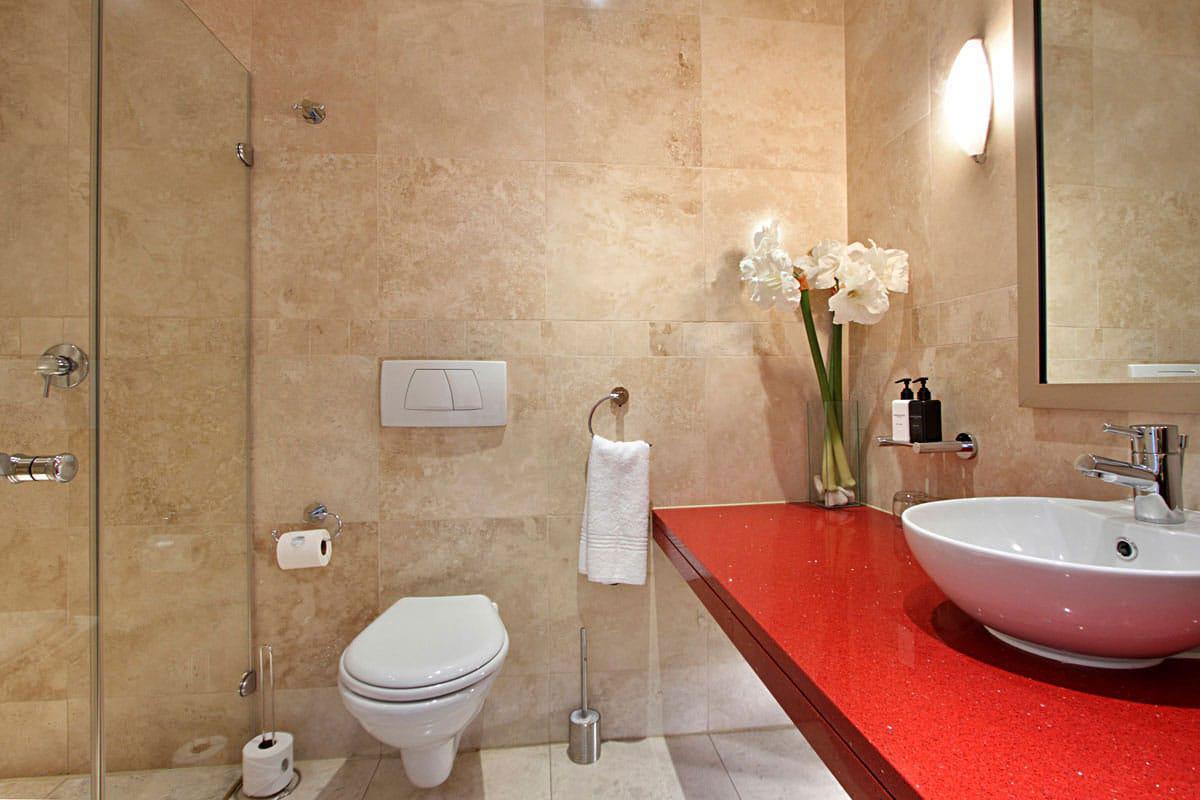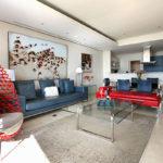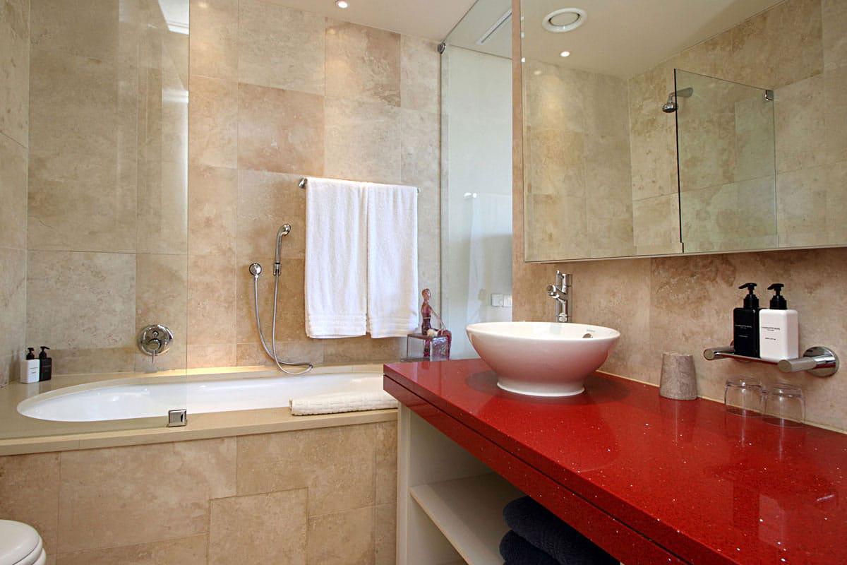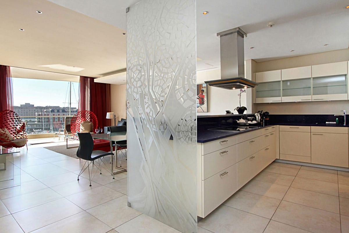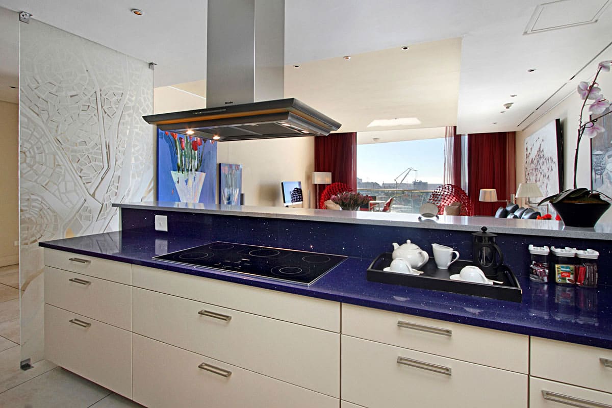 Leather, wood, glass and chrome combine to express a fresh “new millennium” look to the best luxury serviced apartment Cape Town has to offer. Splashes of primary colours from original canvasses and artworks add vibrancy and interest to the spacious, yet homely, open planned lounge and dining area. The contemporary leather sofas are softened with flocati scatter cushions while the Chilli red silk drapes overlain with burgundy metallic organcy are dreamy. Relax here after dinner with the shimmering lights of the V&A Waterfront outside.
