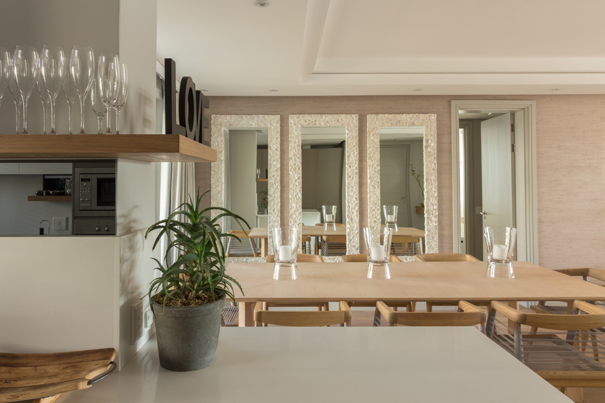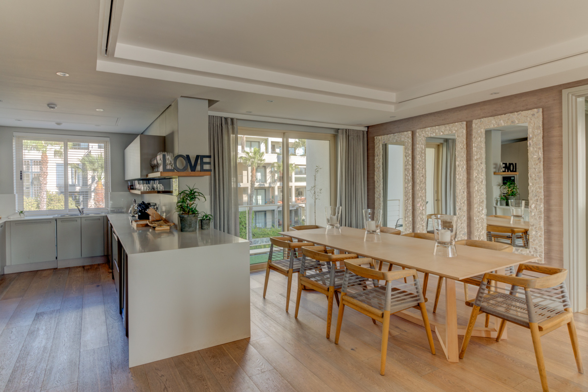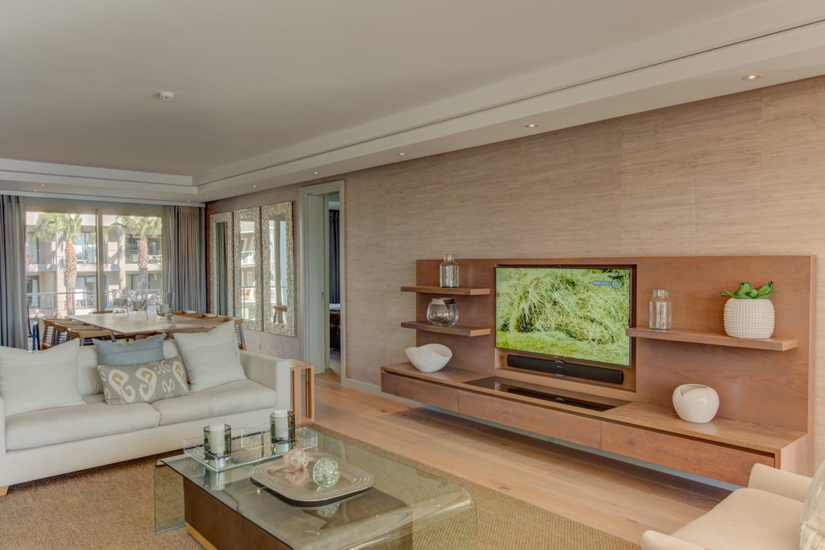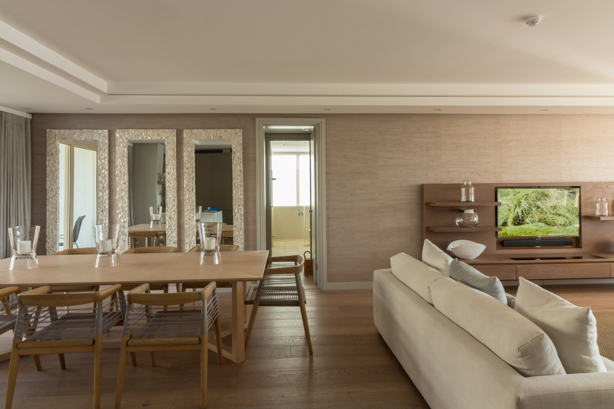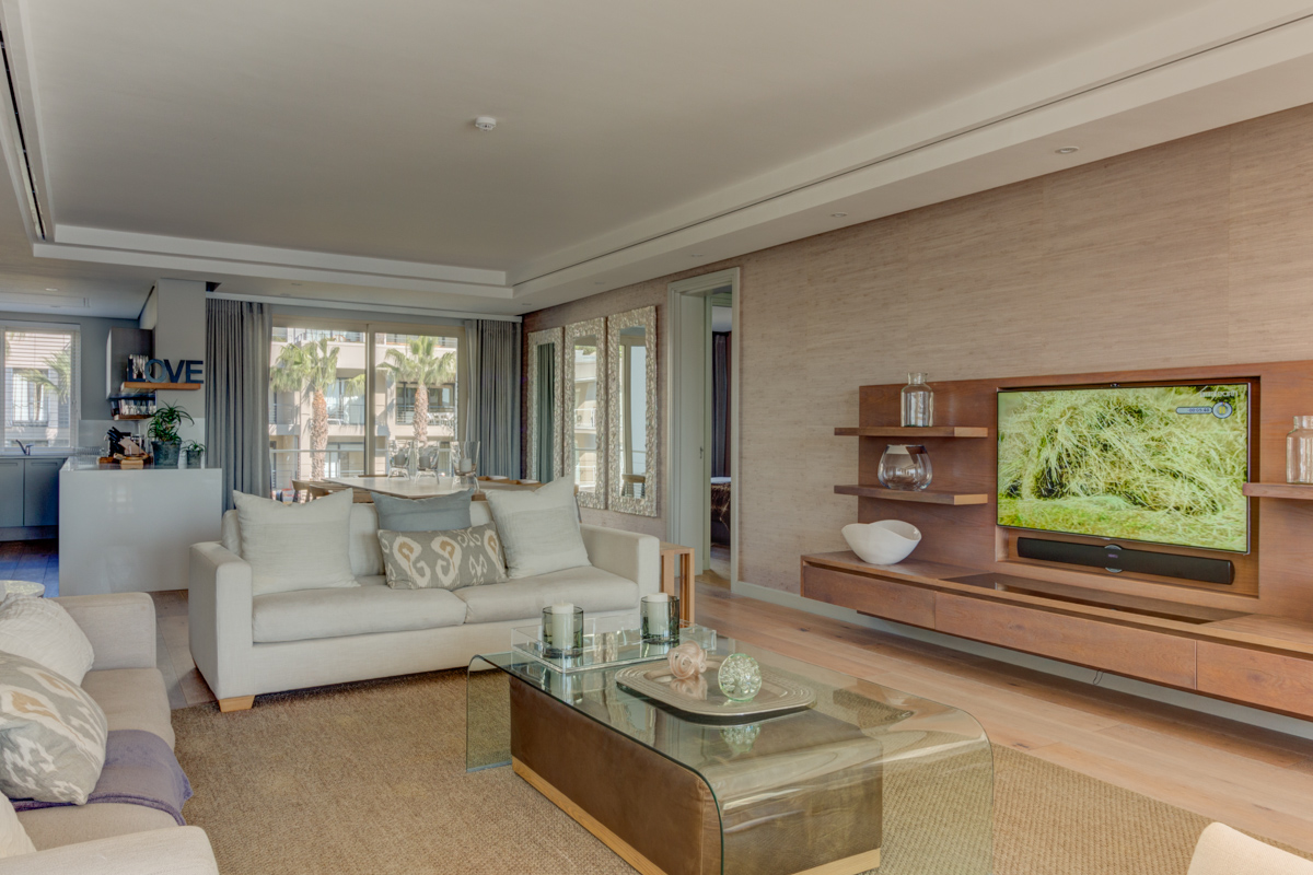 Lovely and light, the living area stretches from one side of the apartment to the other; with the kitchen located at the rear, formal dining for 8 guests in the middle and ending in the TV lounge.